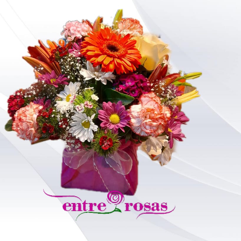Arreglo silvestre en tonos rosados, con liliums, toques de gerberas y flores de temporada, para saludar  a mamá.